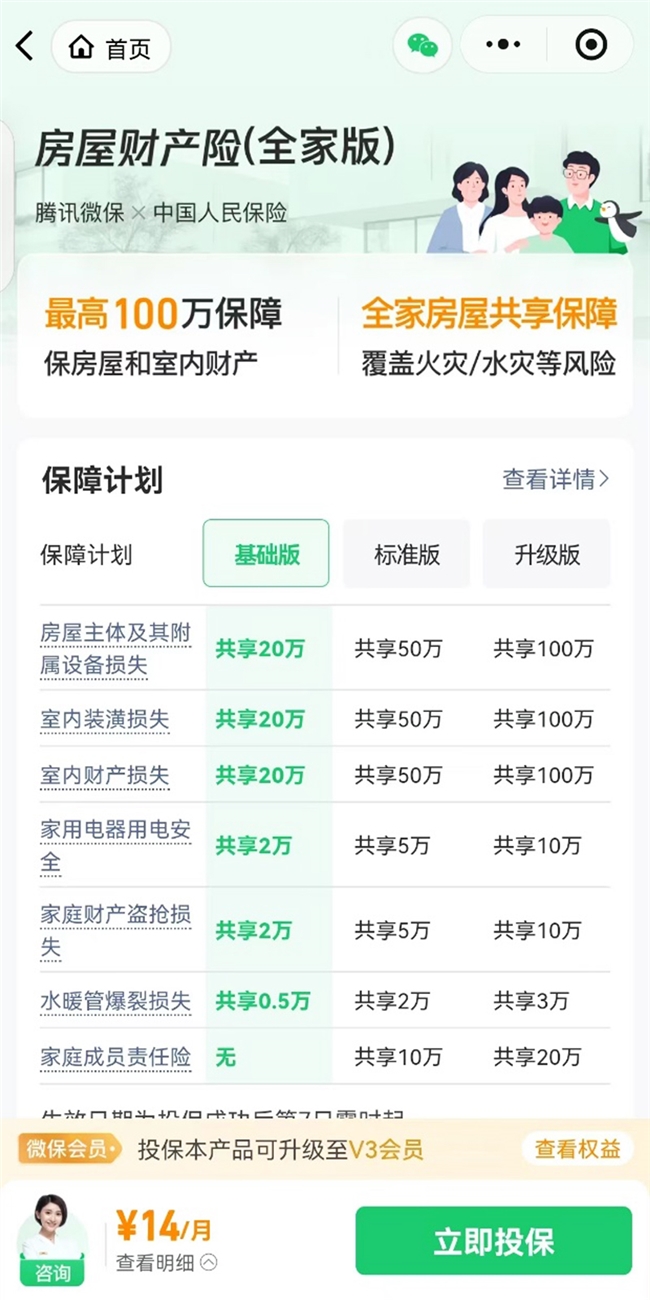 微保平台的可靠性首先源于其背景,作为腾讯官方保险代理平台,微保对接的是保险公司,平台的“家财险”产品由中国人民保险等持牌机构承保,确保了保障的最终效力。